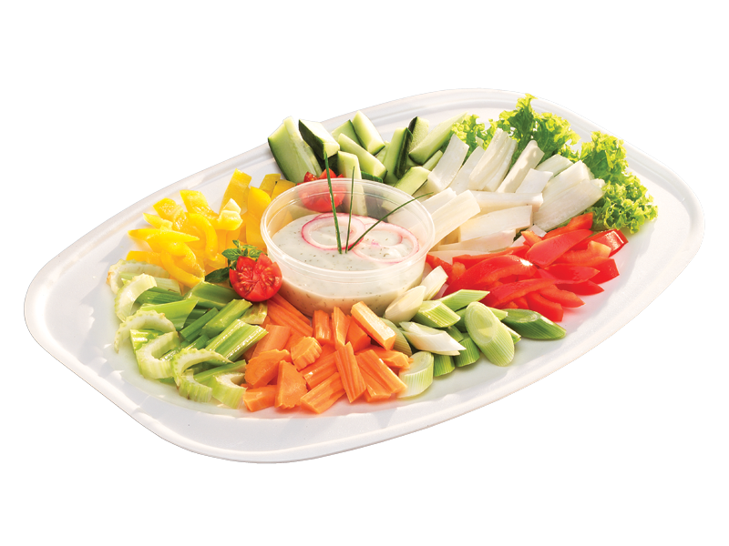 Összetevők: angol zeller, sárgarépa, póréhagyma, kaliforniai paprika, jégretek, uborka, kapros fokhagymás öntet
